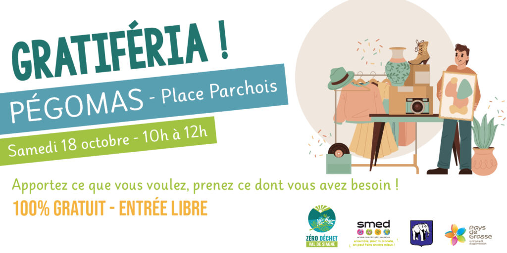 Gratiféria à PégomasSamedi 18 octobre 2025, de 10h00 à 12h00, Place Parchois Dans le cadre du Défi « Rien de neuf » lancé par Zero Waste France, le SMED se joint à l’association Zéro Déchet Val de Siagne pour l’organisation de sa Gratiféria à Pégomas. Objectif : donner une 2ème vie aux objets dont vous ne voulez […]