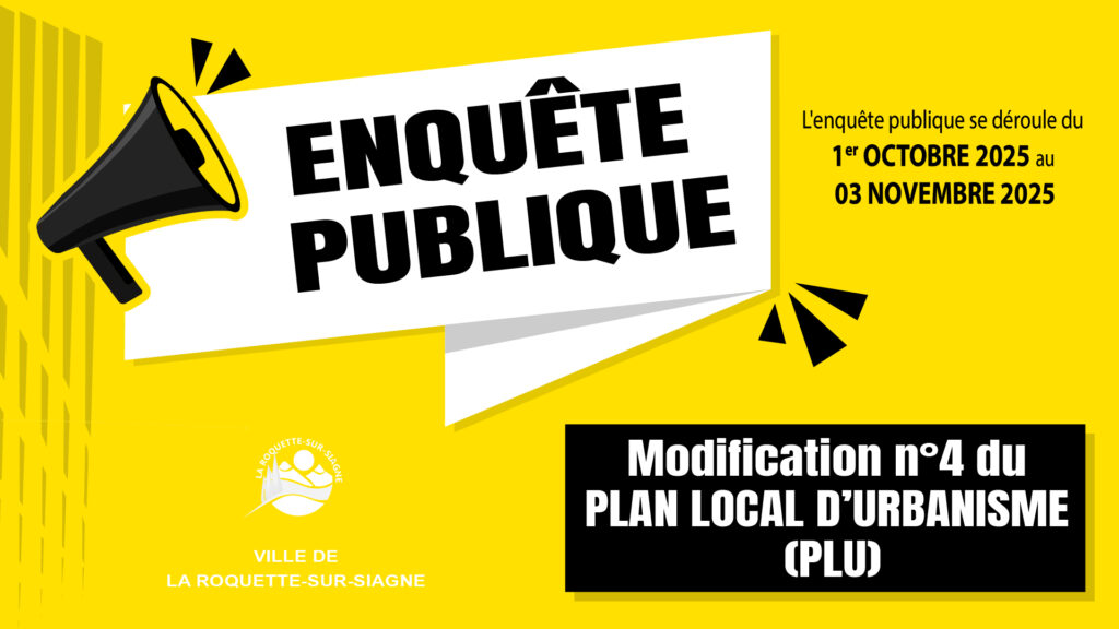 Relative à la procédure de modification n°4 du plan local d’urbanisme (PLU). Du 1er octobre au 3 novembre 2025 L’enquête publique portant sur la modification n°4 du Plan Local d’Urbanisme de la commune de La Roquette sur Siagne, faisant l’objet d’une évaluation environnementale, ayant notamment pour objet de : L’enquête publique se déroule du 1er octobre […]
