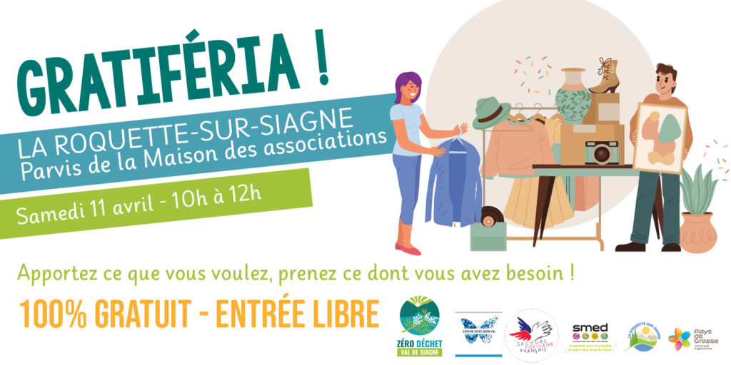 Samedi 11 avril 2026 | 10h à 12h – Maison des associations – LA ROQUETTE-SUR-SIAGNE Donnez une seconde vie à vos objets ! Le SMED 06 (Syndicat Mixte d’Elimination des Déchets), en partenariat avec l’association Zéro Déchet Val de Siagne, vous invite à participer à sa grande Gratiferia le samedi 11 avril. Cet événement s’inscrit […]