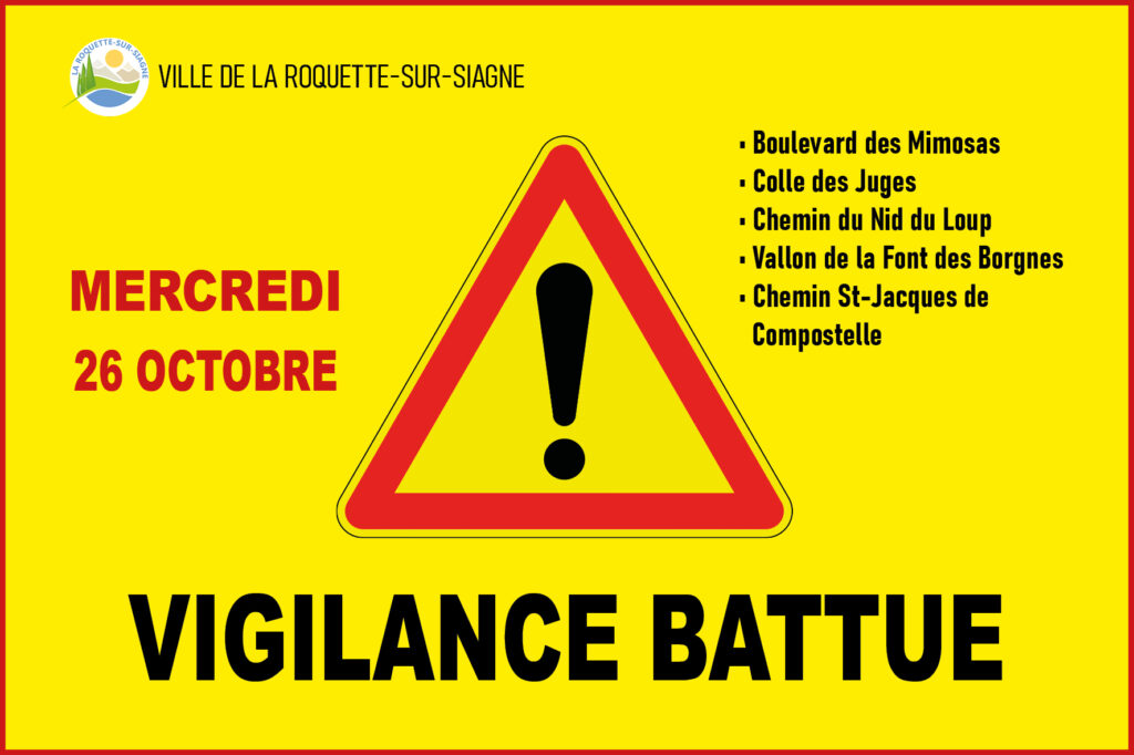 Une battue administrative va être organisée le MERCREDI 26 octobre, entre 7h et 13h, sur la commune. Secteurs concernés Boulevard des Mimosas Colle des Juges Chemin du Nid du Loup Vallon de la font des Borgnes Chemin Saint-Jacques de Compostelle Restons vigilants sur ces secteurs.